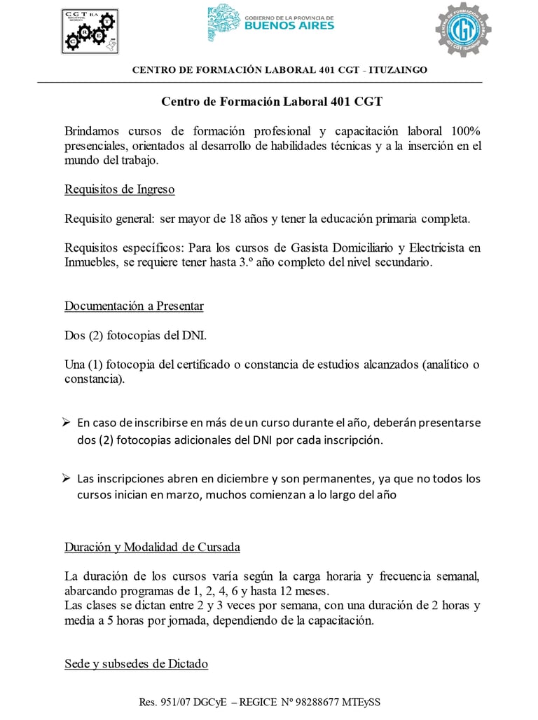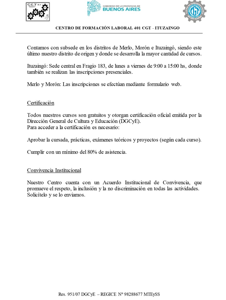 401 de Ituzaingó, conveniados con la CGT Regional Morón, Hurlingham e Ituzaingó. Contamos con subsedes en todos los distritos anteriormente nombrados.